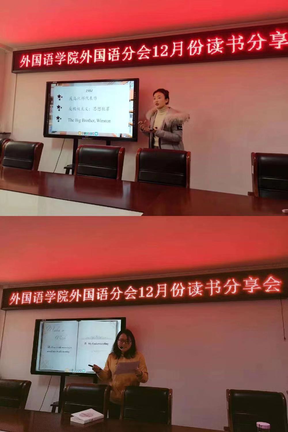 12月17日下午,外国语学院在行政楼803举行读书分享会活动,外国语学院教师魏逸亭,赵瑞,陆岱宝,蒋博如,黄琳,闫素芬,王晓玉,韩江霞参加了读书分享会活动。12月24日下午,外国语学院在行政楼803为此次读书分享会举行了颁奖活动。这次读书分享会旨在增强外国语学院教师提升专业素养及人文素养意识,同时进一步加强师德师风建设,以便更好地成为学生的引路人,也体现了外国语学院不断加强教师队伍建设和对“三全育人”内容的贯彻和实施。活动上,各位教师分享了《1984》、《社会的麦当劳化》、《做一个幸福的教师》、《人类简史》、《面纱》等书籍,对作家作品进行了介绍,书籍作品内容丰富,思想深刻,切合教师生活,契合当下社会发展,引发了全院教师对书籍作品的热烈的讨论和交流。参与分享的教师结合自己的授课内容和授课经验,在分析作品内容的同时还分析了作品的写作技巧,并表示会将读书的心得体会融入到日常的授课中去。24日下午,外国语学院对参与读书分享会的教师进行了颁奖,奖项设置了最佳推荐奖,最佳分享奖,最佳人气奖。