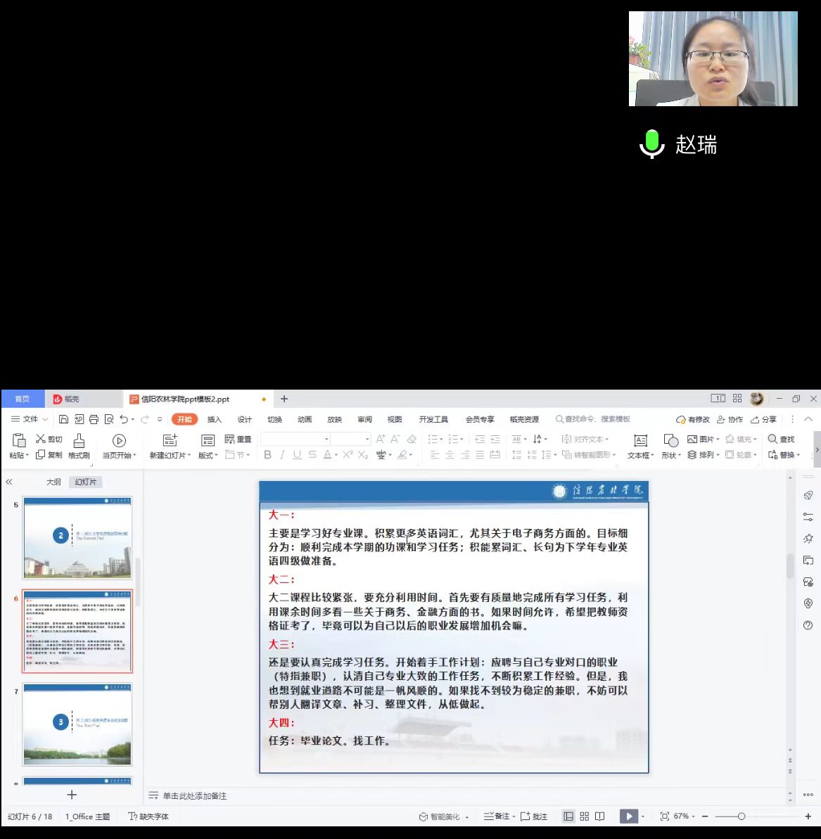 会议中,赵瑞老师就商务英语专业学生如何学好专业课程、提升专业素养提出了具体建议,并结合生动的例子引导学生们提高自律性。她鼓励同学们要勤于学习、敏于求知,尽快完成从中学生到大学生的角色转变,养成积极向上、严于律己的学习习惯,注重积累阅读量,不断夯实专业基础,让大学生活充实而有意义。