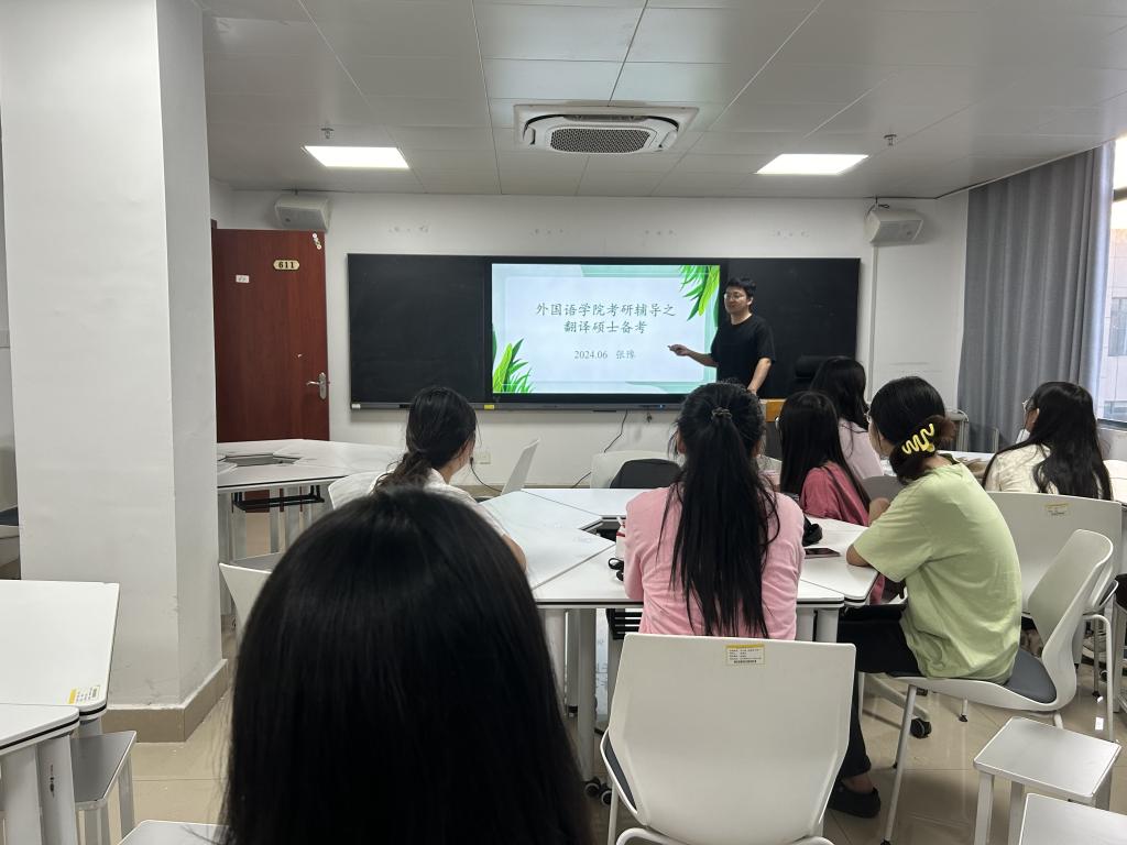2024年6月6日19点,外国语学院在综合楼611举办了专业英语考研辅导系列讲座第五讲——翻译硕士备考。本次讲座由外国语学院专任教师张豫主讲,学院22级翻译专业和21级商务英语专业部分学生参加了本次讲座。