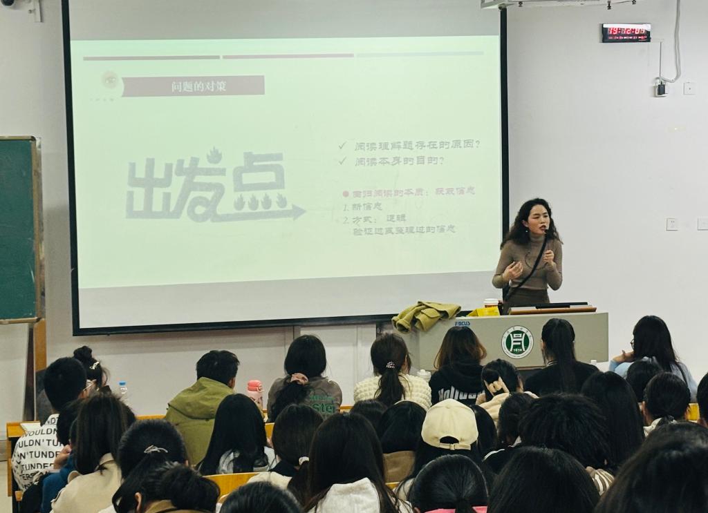 本次讲座以四六级阅读部分为主讲内容,分别从全国大学英语四六级考试大纲解读、英语阅读中的常见问题及解决对策、题型技巧讲解三个角度切入,为学生梳理学习思路,提供学习策略。首先,黄老师从全国大学英语四六级考试大纲解读入手,带领学生理清四六级阅读理解的考查重点,建议学生有针对性地提升英语阅读能力,复习备考四六级。紧接着,黄老师对写作过程中常见问题进行了分类总结,并提出针对性的学习方法指导。她引导学生从单词、句子、句子之间的衔接、段落与篇章四个角度反思英语阅读中存在的困难,有针对性地进行分层讲解,提出对应的学习策略。最后,黄老师针对四六级阅读理解的题型进行分析,引导学生掌握有效的解题技巧。黄老师特别强调,阅读应回归其本质,即学生应主动从阅读文本中获取信息并组织逻辑,以提高阅读理解能力。通过这些方法,学生能够更有效地应对四六级考试中的阅读部分。