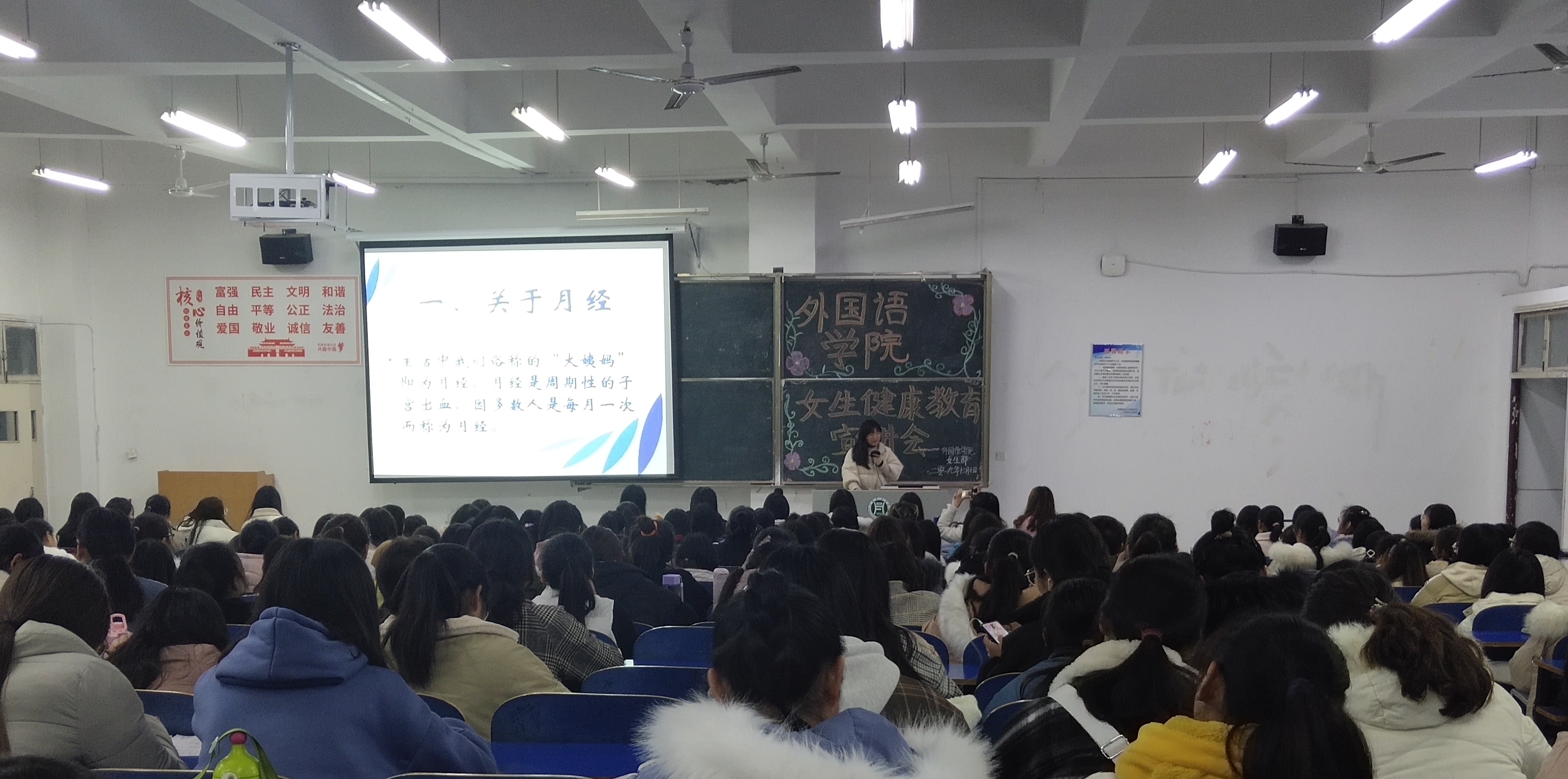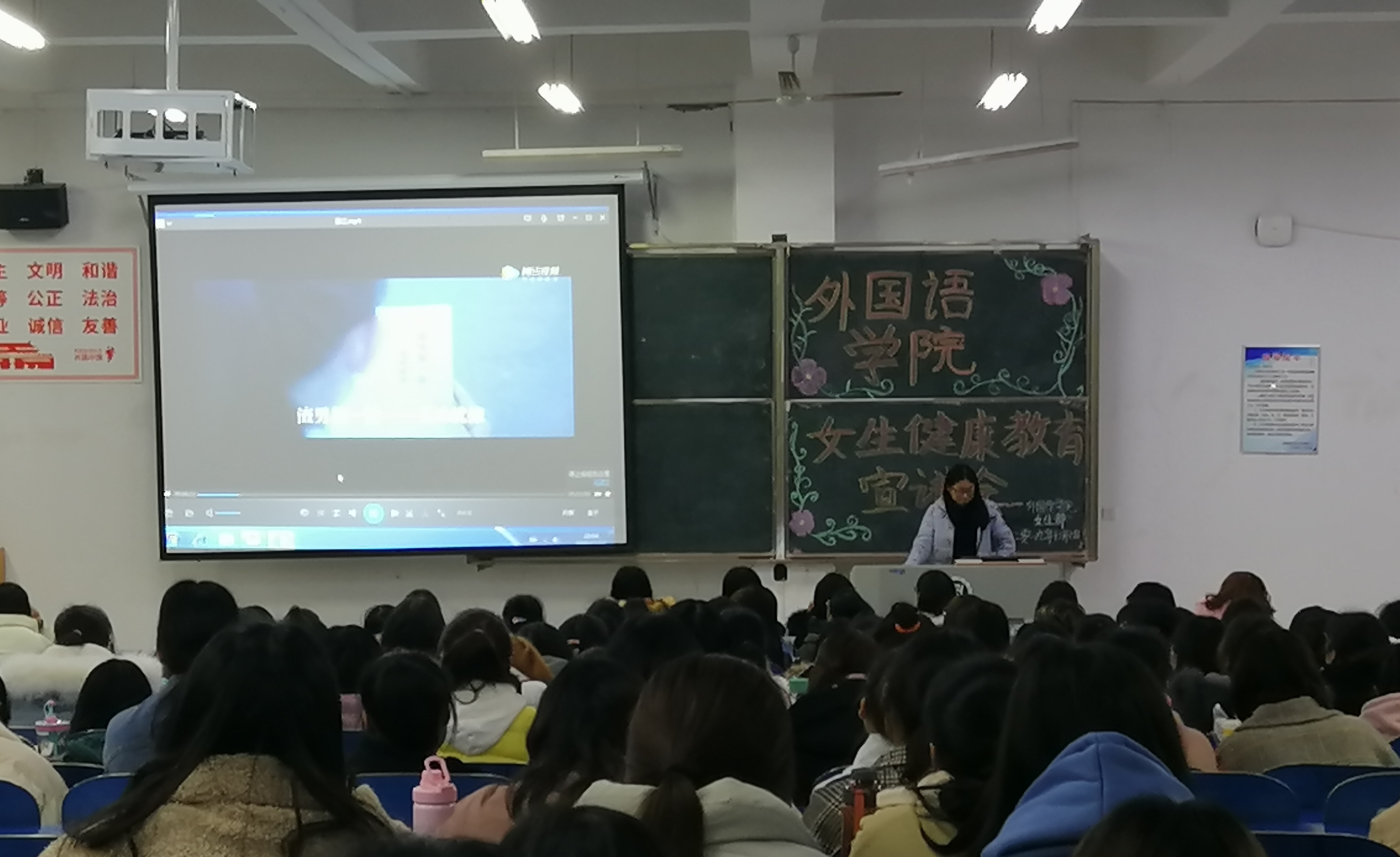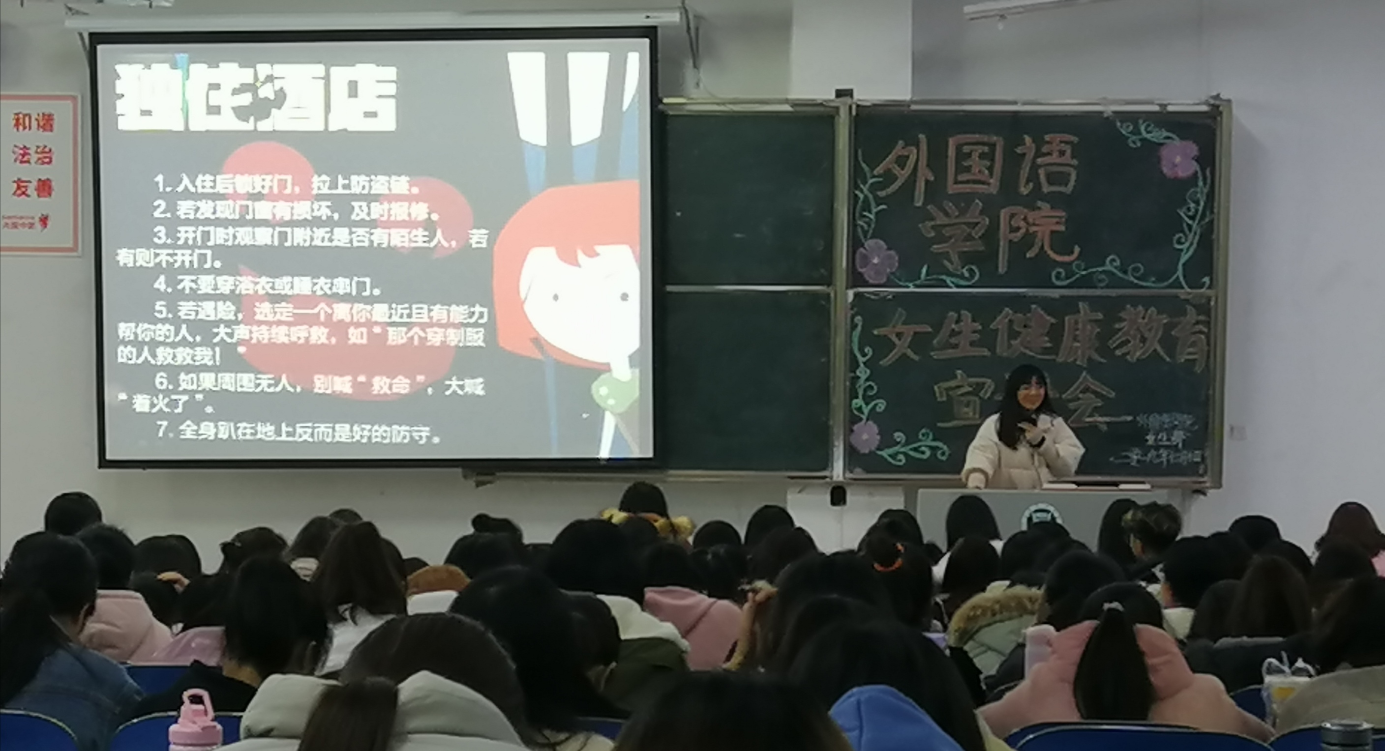 女生健康安全教育是高校工作的重要组成部分,为增强我院女生安全健康意识,帮助其身心健康快乐成长,2019年12月10日晚,外国语学院在一教E102举办了以女生健康安全为主题的宣讲会,宣讲会由学生代表刘素红主持,我院 2019级全体女生及部分学生干部代表参加。