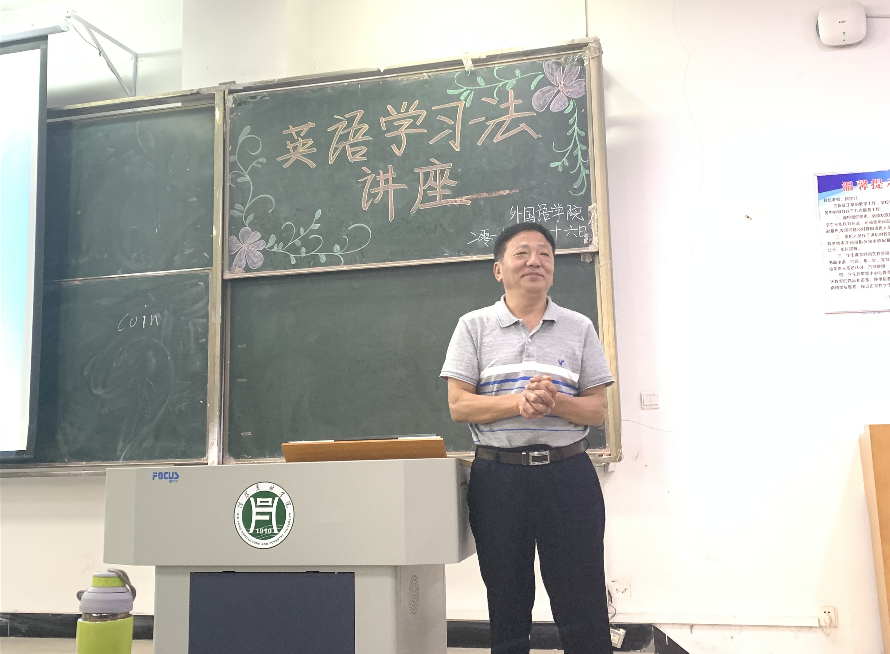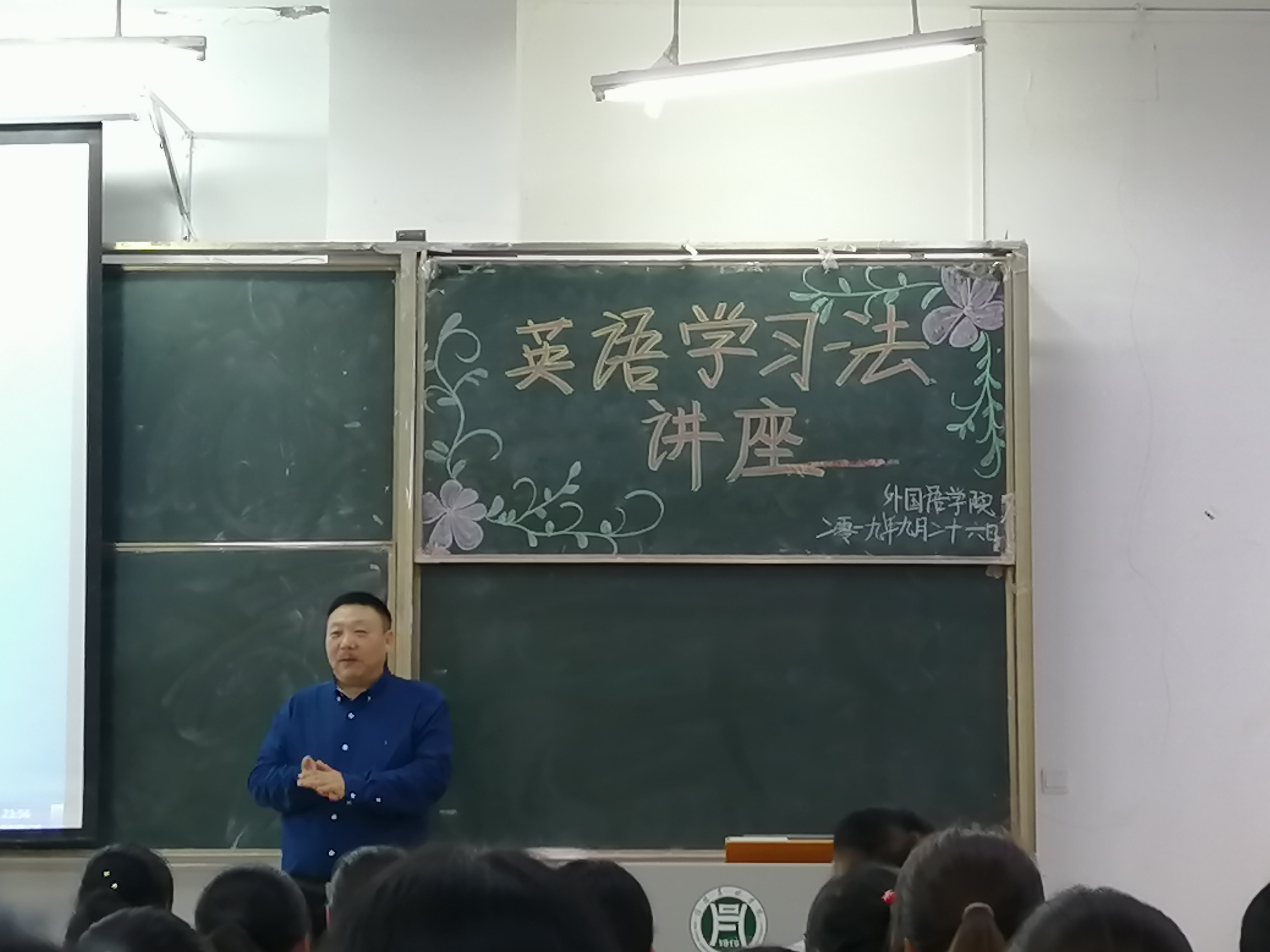 9月26日上午八点,外国语学院学院院长滕海、宛磊教授在一教E102为全体2019级新生作了以“英语学习法”的精彩讲座18级辅导员徐文君、19级辅导员宋昕陈嘉及全体新生共同参与了本次讲座。