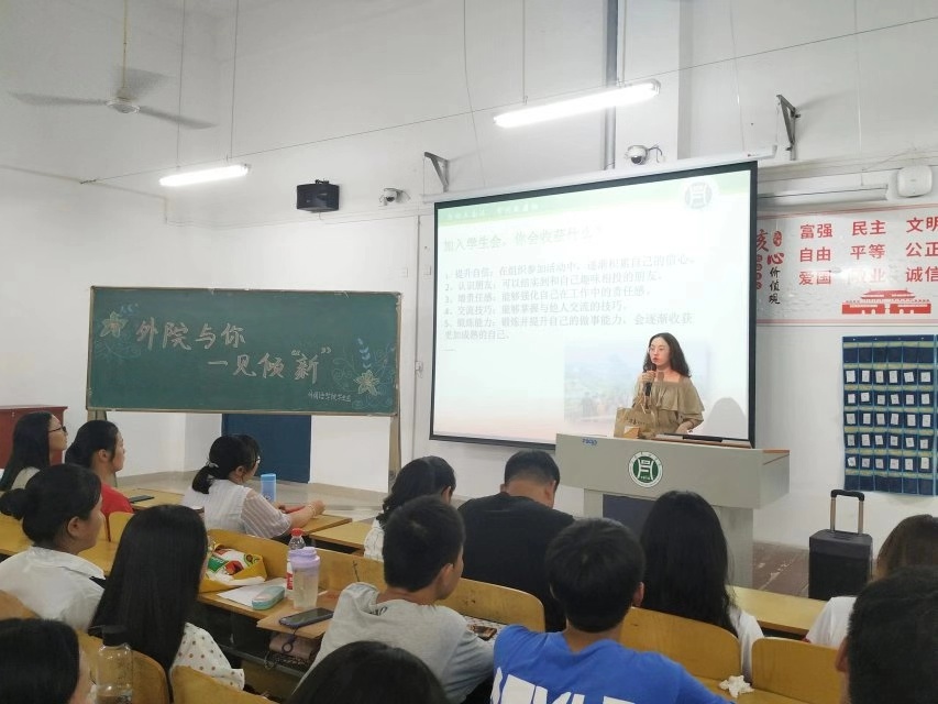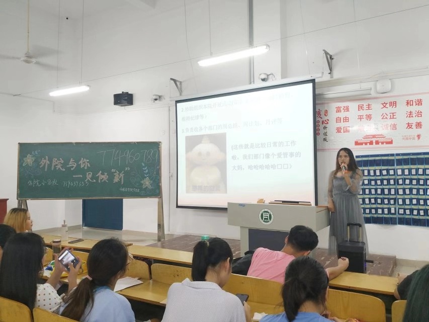 为帮助新生更快适应大学生活,提高其学习热情,坚定其理想信念,9月11日19点,外国语学院分别于二教404、406同时开展了以"外院与你,一见倾新"为主题的新老生见面会暨学生会职能介绍大会,外国语学院主席团成员、学生会各部门代表以及全体19级新生参会。