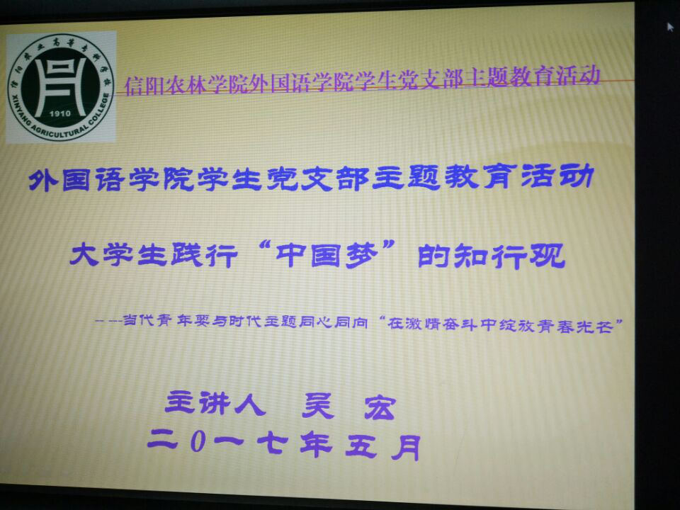 为做好预备党员和入党积极分子的培养教育,深入学习习近平总书记系列重要讲话精神,落实学校党委组织部及党委宣传部关于学习“习近平考察中国政法大学讲话精神”教育活动的要求,5月23日下午,外国语学院在行政楼803组织开展了以“大学生践行中国梦的知行观”为主题的 党员及入党积极分子主题教育培训活动。活动由外国语学院学生党支部书记吴宏老师主讲,外国语学院全体党员、学生干部及入党积极分子参加了此次活动