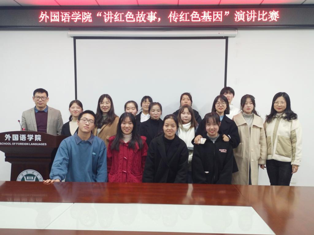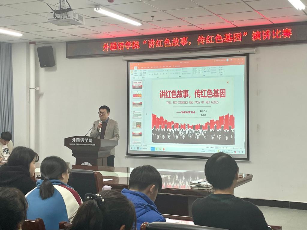 红色基因是共产党人永葆本色的生命密码。为增强学生对中华民族的归属感、认同感、尊严感和荣誉感,外国语学院于11月24日在人文艺术楼402举办了“讲红色故事,传红色基因”演讲比赛。外国语学院党总支副书记吴宏,辅导员高宇、李金慧、关迎雪,学生会主席团部分成员及部分大一学生参与了此次活动。