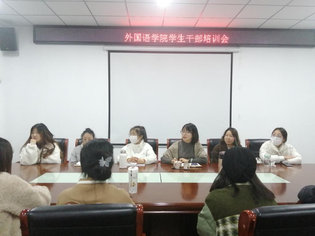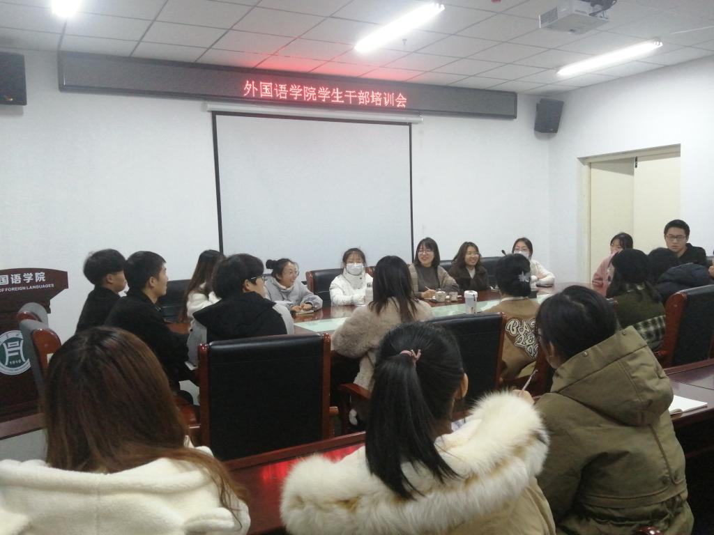 12月1日晚,外国语学院在人文艺术楼402召开院学生干部培训会,会议由高宇老师主持。院团总支、学生会、自律委员会全体学生干部参加了本次会议。