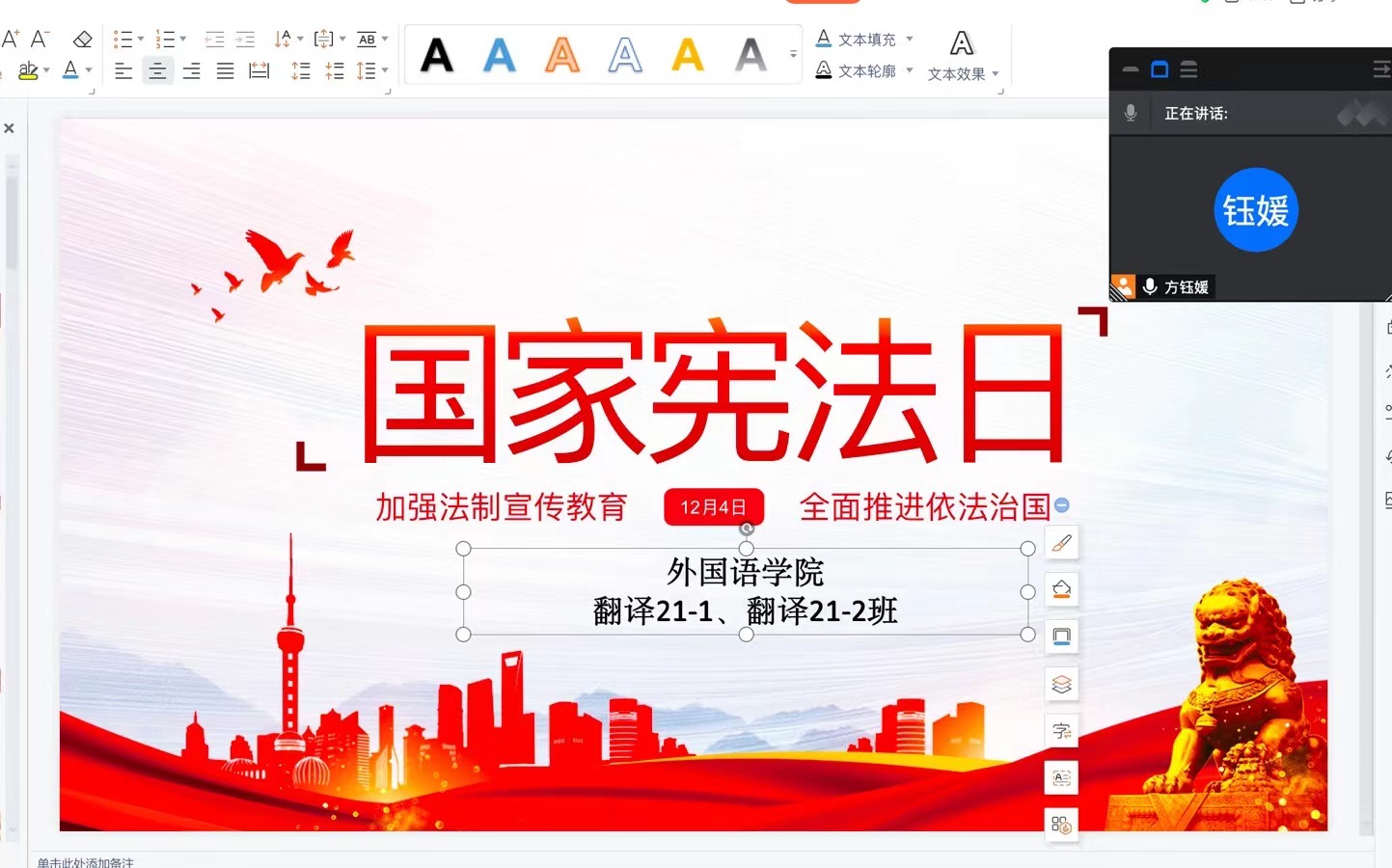 为进一步弘扬宪法精神、普及宪法知识,培养学生学法、知法、守法、法的法治意识外国语学院1130日至123日开展了“学宪法、守宪法”主题班会由各班辅导员负责进行