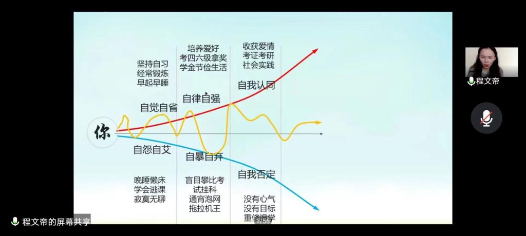 首先,程文帝老师向大家介绍了校心理咨询室的位置、环境及预约流程。接着,程老师就友情、亲情、爱情三方面对大学生学业环境的变化、人际模式的变化、大学生自我认知以及和家庭关系的变化等方面进行了详细的讲解,使同学们正确认识到与朋友相处的模式,如何在校让父母放心,恋爱关系中两性心理差异及有效的应对方法。讲座的最后,程文帝老师从“积极适应”与“消极适应”两方面进行分析,鼓励同学们一起正面地适应大学生活,提醒大家不要辜负大学时光,不为自己留下遗憾,从心出发、追寻理想。