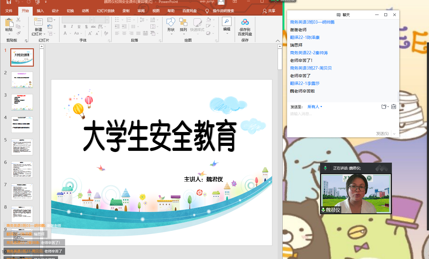 接下来新生辅导员魏君仪老师给大家带来了《大学生安全教育》主题报告,魏老师以讲故事的形式,用生动活泼的语言分享了自己在安全问题上的心得体会,告诫广大新生谨记“安全无小事”,在各方面提高警惕,从而享受安全舒适的大学生活。