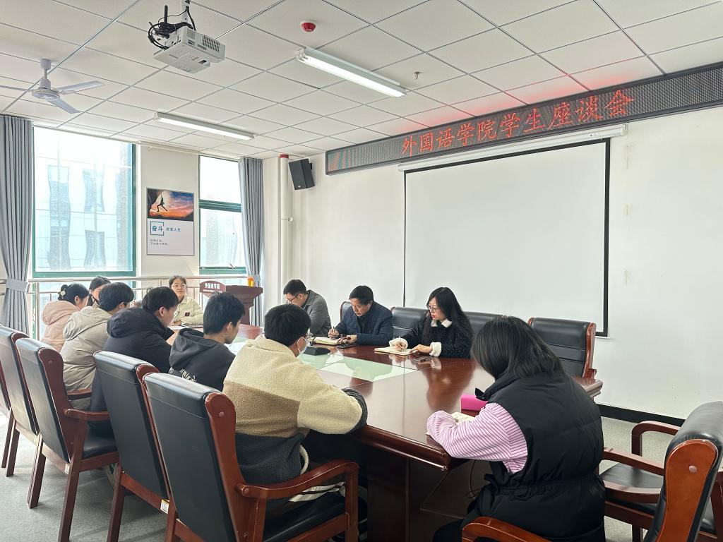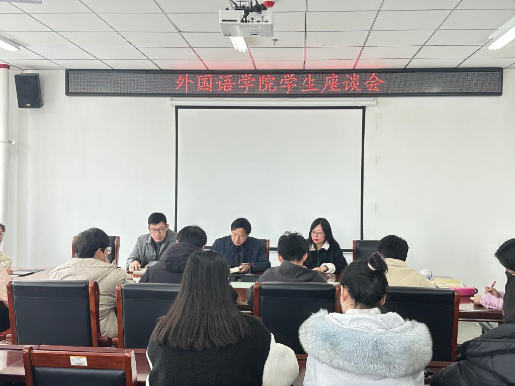 为更好地践行“以学生为中心”的理念,更充分了解学生诉求,外国语学院于2月24日下午3时在文学艺术楼402召开了学生座谈会。院党总支书记张志强、副院长芦晓莉、党总支副书记吴宏和优秀辅导员代表魏君仪参与,座谈会由团总支书记高宇主持。