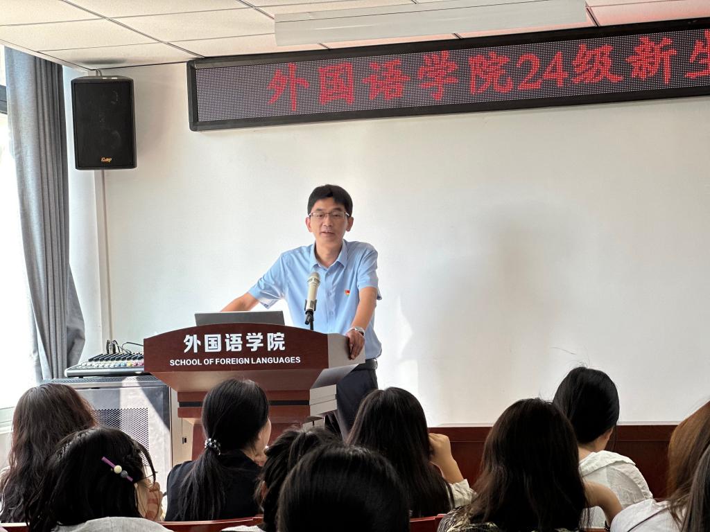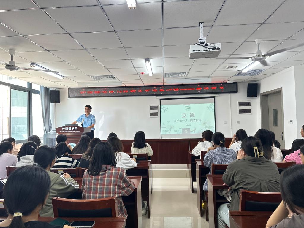 为提升 2024 级外国语学院新生的廉洁意识,9 月 24 日学院党总支书记蔡志在开学第一课中开展了一场意义深刻的廉洁教育讲座。讲座在学院205会议室举行。