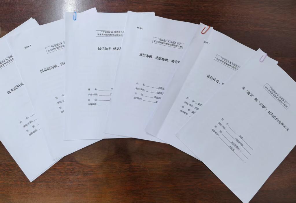 外国语学院学子紧扣“守诚信之本,怀感恩之心”主题,结合自身的经历与感悟,用真挚的文字阐述了对诚信的理解、资助政策对自己成长的影响以及如何在未来践行诚信理念。一篇篇征文饱含深情,展现了同学们自立自强、诚实守信的精神风貌,也体现了对国家资助政策的感恩之心。本次比赛共收到征文69篇,评审老师对所有征文进行认真评选,从文章的内容、结构、语言表达以及思想深度等多个维度进行考量,最终经过学院初选确定管梦梦6位同学的征文上报学校,参加校级评选。