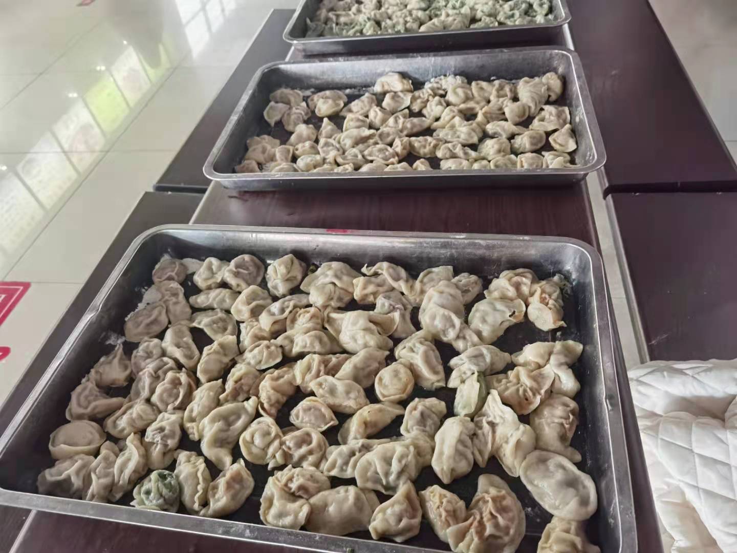 活动开始前,大家将材料准备齐全,擀面杖、面团、饺子馅等在食堂的工作台上一字摆开。在关迎雪老师的带领下,同学们分工明确,包饺子活动正式开始。关迎雪老师和大家一起亲手调馅、擀面皮、包饺子,全身心地投入到活动中。经过一个多小时的团结协作,在一片欢声笑语中,一个个饱含着幸福和温暖的饺子整整齐齐地摆满了托盘。饺子里包的不仅是辛苦调制的馅料更是师生之间满满的情谊。活动最后,同学们在各班班长的组织下,帮助食堂阿姨收拾餐桌和餐具。