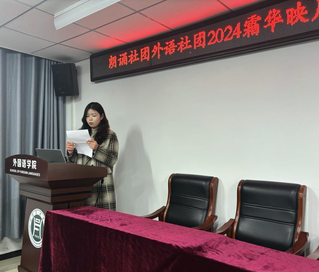 2024年11月6日,外国语学院朗诵社团和外语社团于3b实验楼会议室205联合举办了霜华映月·诗意流淌——立冬诗歌朗诵晚会,弘扬传统文化,颂扬敬畏之心。