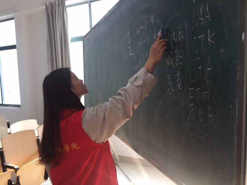 活动开始,同学们按时到教学楼的空教室,首先将教室里的黑板擦干净,并且用自带的抹布将黑板擦拭了一遍。同学们主动将布满灰尘的讲台收拾干净,为老师提供一个清洁的教学平台。对于一些桌椅凌乱的教室,同学们又齐心协力将桌椅摆放整齐,并将桌子上的垃圾倒入垃圾桶内,使前来上课的同学能够有一个整洁的学习环境。