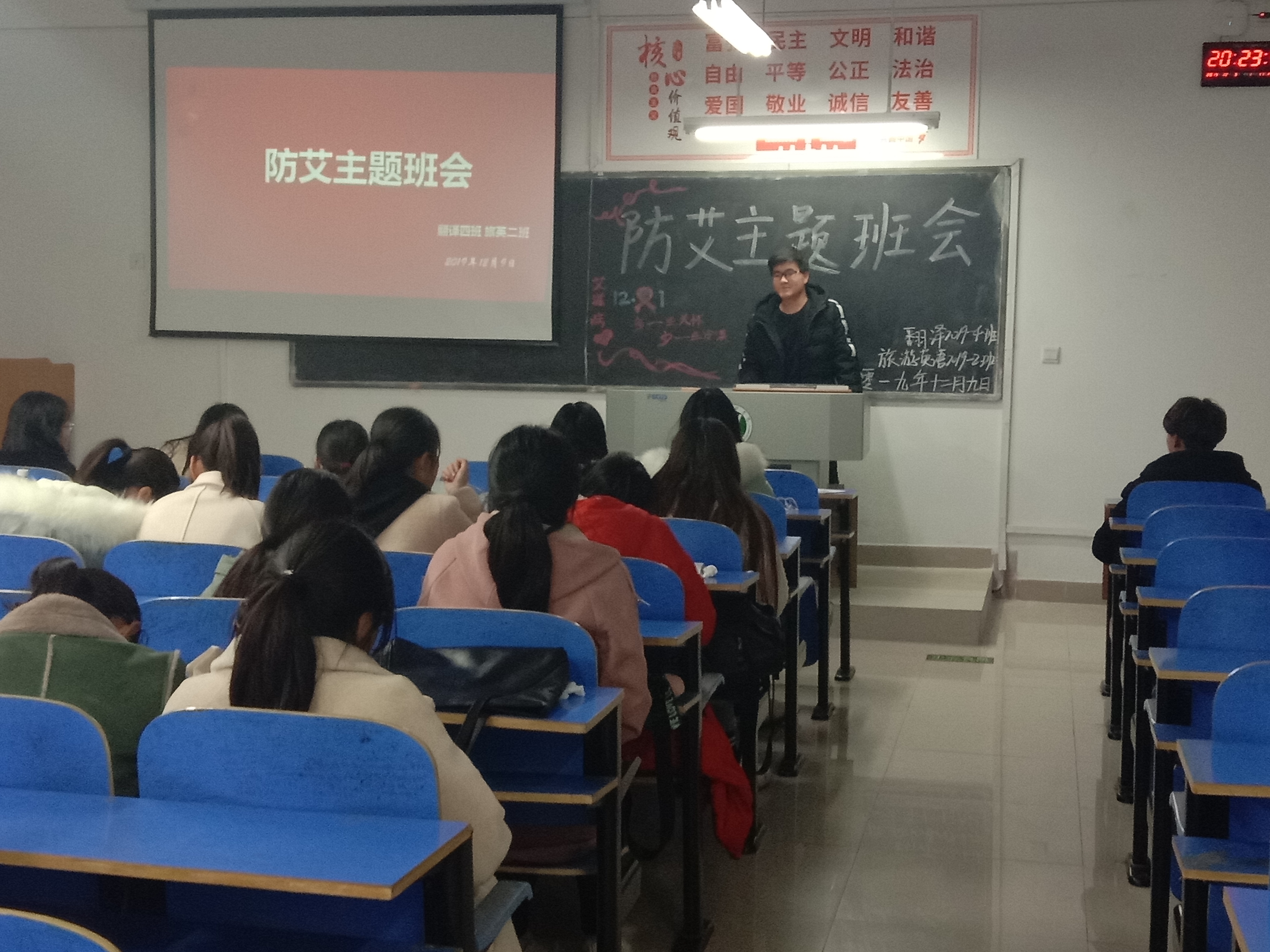 为加深大学生对艾滋病的了解,提高对艾滋病的防范意识,传播健康教育知识,打造和谐美好校园,12月9日晚,外国语学院各班级召开“预防艾滋病”主题班会。