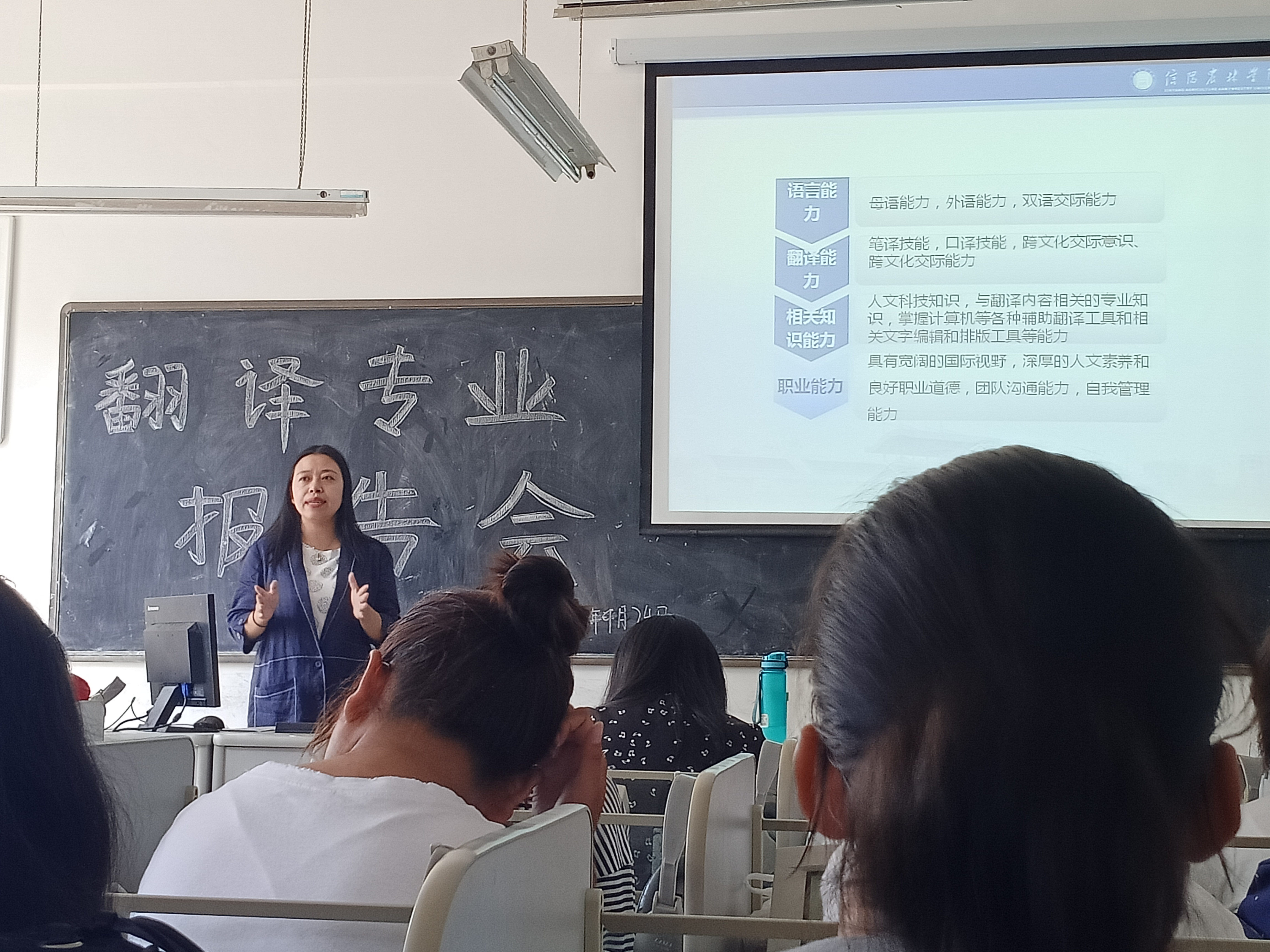 骨干教师代表张霞向同学们讲解了商务英语专业的定义,并分析了本专业的定位及毕业发展前景,为同学指明了以后奋斗的目标。