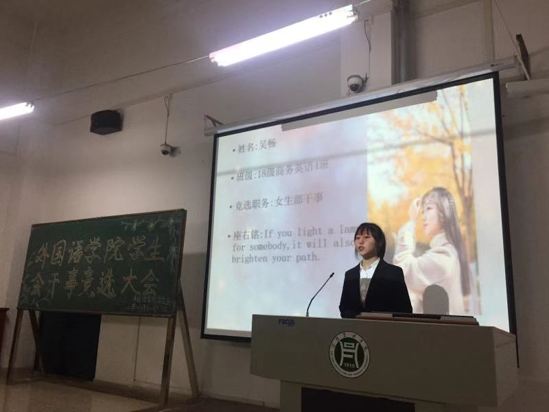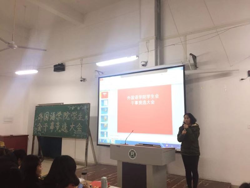为了进一步巩固和完善学生会机制,更好的服务于同学,同时使新生尽快融入大学生活。我院于2018年12月16日晚6点在二教406举行了干事竞选大会。大会由外国语学院团总支副书记范琼琼老师以及主席团成员担任评委,学生会各部门成员参加了本次竞选。