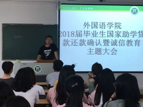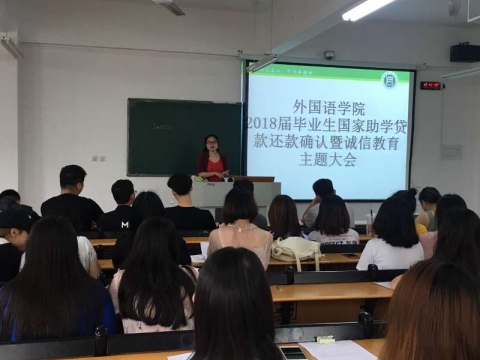 为做好国家助学贷款学生贷后管理工作,确保我院贷款工作顺利进行,6月1日中午12:30,外国语学院在二教101教室召开2018届毕业生国家助学贷款还款确认暨诚信教育大会,外国语学院贷款及资助专员闫达老师、毕业班辅导员赵瑞老师以及2018届应用英语全体毕业生参加了此次会议,会议由闫达老师主持。