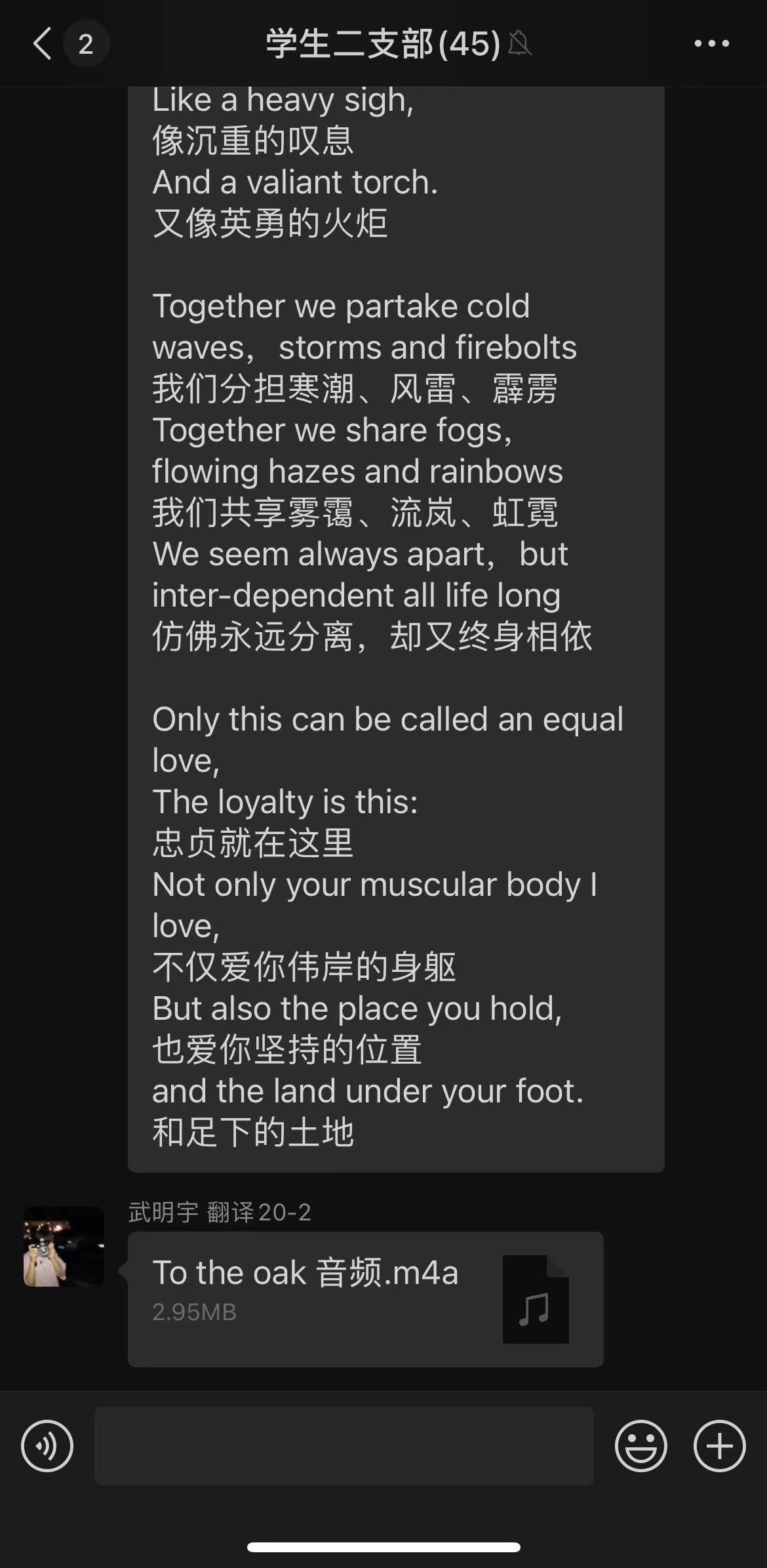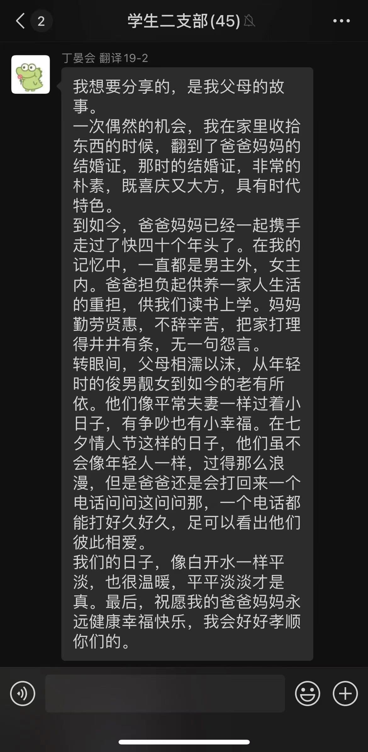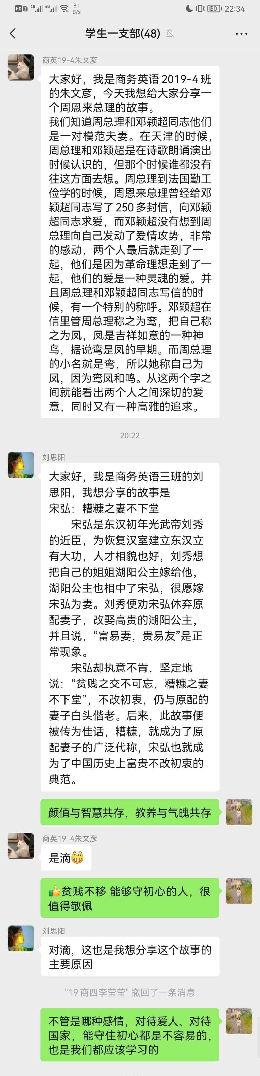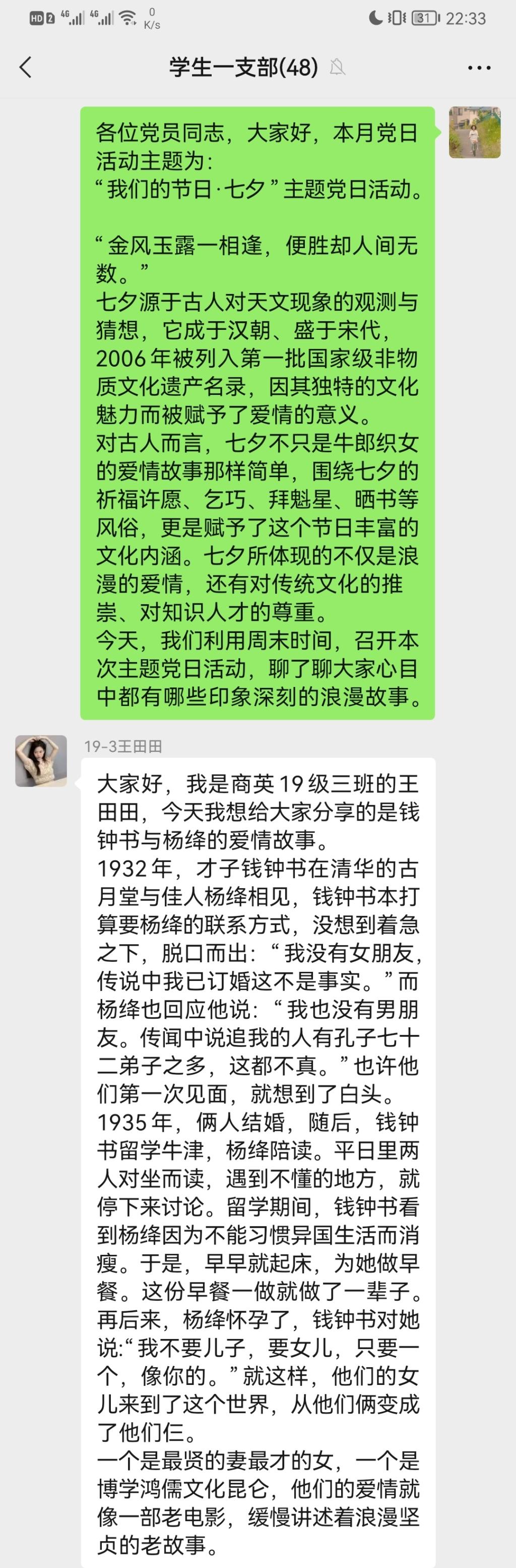 七夕源于古人对天文现象的观测与猜想,它成于汉朝、盛于宋代,2006年被列入第一批国家级非物质文化遗产名录,因其独特的文化魅力而被赋予了爱情的意义。对古人而言,七夕不只是牛郎织女的爱情故事那样简单,围绕七夕的祈福许愿、乞巧、拜魁星、晒书等风俗,更是赋予了这个节日丰富的文化内涵。七夕所体现的不仅是浪漫的爱情,还有对传统文化的推崇、对知识人才的尊重。活动中,几位党员一一分享了令自己印象深刻的爱情故事:朱文彦同志分享了模范夫妻周恩来与邓颖超的小故事,王田田同志分享了钱钟书与杨绛相识一眼便是一生的相濡以沫,魏清琳同志引用冰心与吴文藻的故事告诉我们有了爱就有了一切,徐志怡同志分享了胡适与江冬秀在旧式婚姻中也能保持幸福的故事,刘思阳同志我们讲述了“糟糠之妻”的来源和相关的传统爱情故事,石晨熙同志分享了奥德修斯与佩涅罗佩的真爱值得等待,王硕同志讲述了重庆的爱情天梯。大家对故事中的爱情观、婚姻观做了探讨。学生第二支部的多位党员同志也积极参与了分享。其中,丁晏会同志分享了父亲母亲四十年相互扶持、风雨同舟的婚姻故事,她认为最好的家风家教就藏在父母的言行里,藏在老一辈平凡的每一天里。李婷同志认为“七夕”不仅体现了人们对理想爱情和美满家庭的向往和追求,更传承发扬了中华民族家庭中强烈的责任心,她讲述了“海南最美家庭”吉英春用爱与责任守护瘫痪丈夫,不辞辛劳照顾家庭的感人故事。武明宇同志朗诵了英文版的《致橡树》,舒婷在诗中为我们描写了理想爱情的模样。真正的爱情,不仅爱你的外表,还爱你的灵魂;爱你的志趣追求,也爱你的理想信念。也只有这样的爱,才经得起风雨的考验。