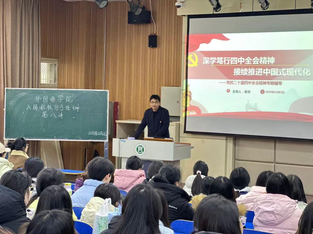 为深入学习贯彻党的二十届四中全会精神,引导青年学子准确把握新时代的使命与要求,12月2日,外国语学院在E101报告厅举办专题讲座。学院党委书记蔡志以“青春奋进新时代,共筑强国新梦想”为题,为学院入团积极分子和青年学子作专题辅导。