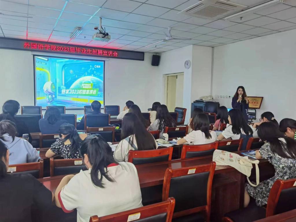 外国语学院于5月23日在文学艺术楼402举办2023届毕业生线下招聘宣讲会,德佑房地产经纪有限公司、信阳圆创磁电科技有限公司、河南乐畔电子商务有限公司三家企业来院进行招聘宣讲。学院党总支书记张志强、副院长冯昱、办公室主任徐文君、就业专员关迎雪以及学院部分代表老师出席此次宣讲会,部分还未就业的2023届毕业生参加了此次宣讲会。