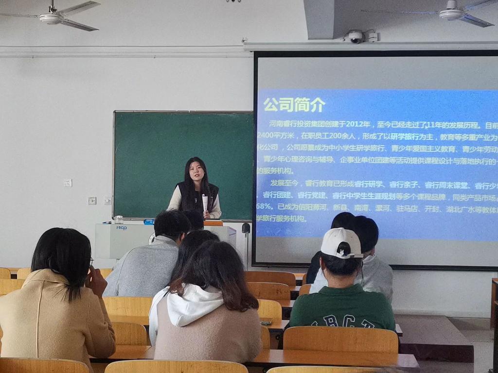 为促进我院毕业生顺利就业、尽早就业。外国语学院于10月20日上午在二教307举办河南睿行教育集团2024届毕业生专场招聘宣讲会。河南睿行教育集团校招负责人张继杏主讲,部分2024届毕业生到场聆听。