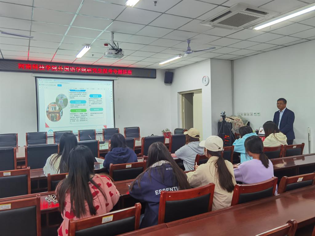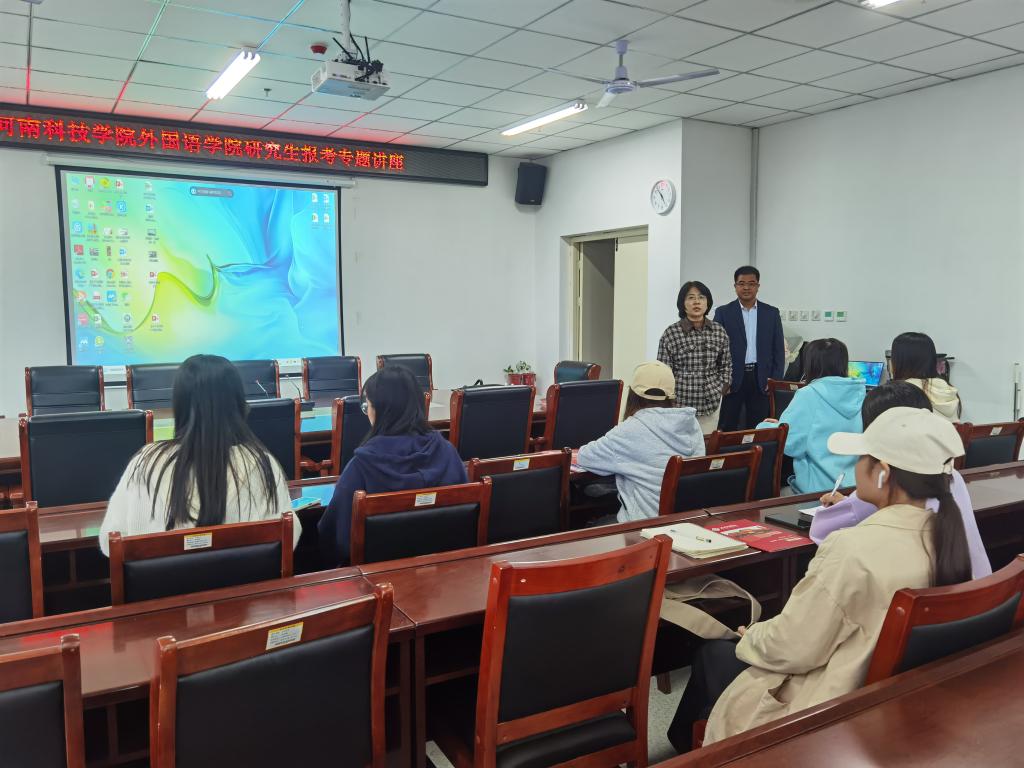 在2023年研究生招生考试报名之际,为使毕业生对研究生报考、复习、面试等内容加强了解,10月9日下午外国语学院在人文艺术楼402举办河南科技学院外国语学院研究生报考专题讲座。此次讲座由河南科技学院外国语学院程建锋副院长主讲,我院冯昱副院长主持,就业专员关迎雪老师以及19级、20级部分学生参加。