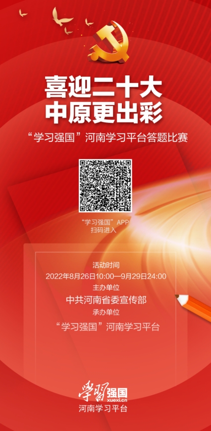 为深入学习贯彻习近平新时代中国特色社会主义思想,营造喜迎党的二十大胜利召开的良好舆论氛围,引导广大党员师生运用“学习强国”学习平台开展理论知识学习,由中共河南省委宣传部主办、“学习强国”河南学习平台承办的“喜迎二十大、中原更出彩”“学习强国”河南学习平台答题比赛已正式上线。结合学校实际,现将具体事项通知如下。
