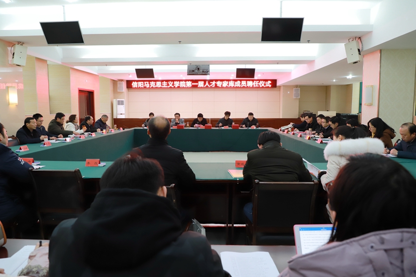 孙军介绍了“信阳马克思主义学院第一届人才专家库成员”的遴选标准及过程。邱兴平宣读了“信阳马克思主义学院第一届人才专家库成员”名单。随后,相关领导向专家库成员颁发聘认证书并合影留念。接着,孙军宣读了《信阳马克思主义学院专家人才库成员考核管理办法》。