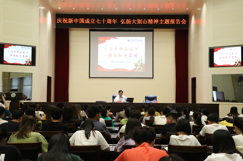 5月28日下午,由党委宣传部和财经学院共同举办的“庆祝新中国成立70周年,弘扬大别山精神”主题报告会在图书馆6楼报告厅召开。信阳市鄂豫皖革命纪念馆馆长吴世儒作了“重温革命历史,传承红色基因”主题报告。财经学院教师和部分学生聆听报告会。报告会由党委宣传部部长王万玲主持。