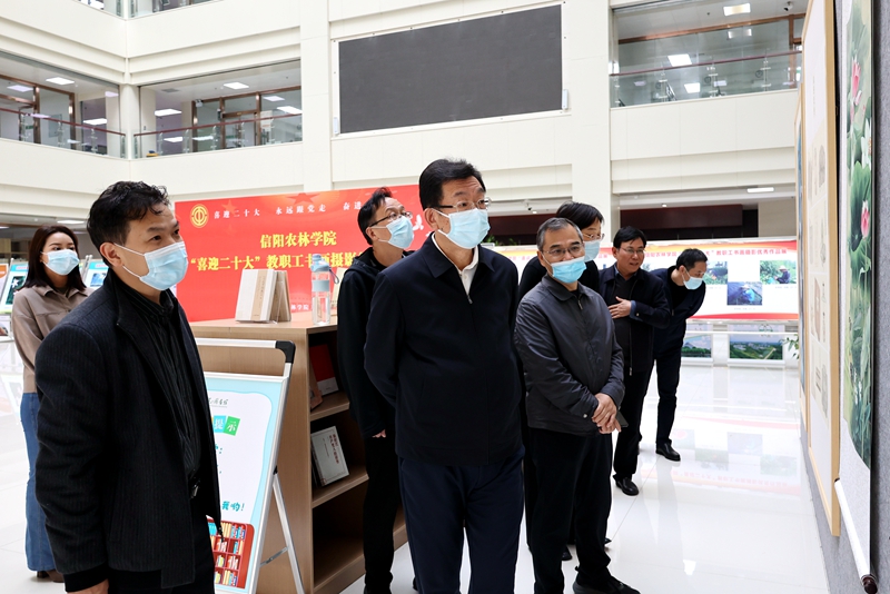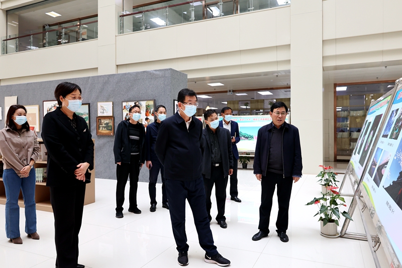 10月31日上午,党委书记余作斌,党委副书记、工会主席王庆兵到图书馆参观beat365在线平台官网“喜迎二十大”教职工书画摄影优秀作品展。党委宣传部、校工会、图书馆负责人陪同参观。