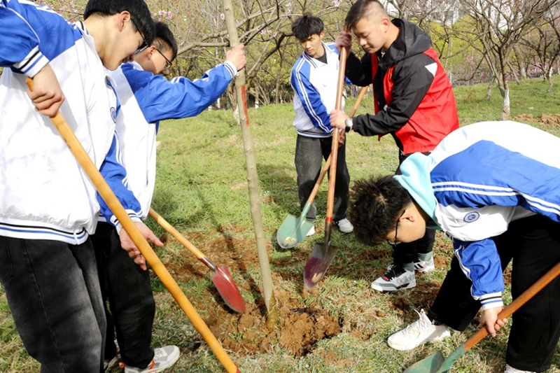 活动中,同学们手抬肩扛,将一株株玉兰树苗搬运至种植场地。在老师指导下,三五结伴,挖树坑、撒底肥、扶苗木、回填土、浇灌水,将树苗栽植妥当。同学们的笑脸和周围盛开的桃花相映成趣,青春的气息让这个春天更显勃勃生机。