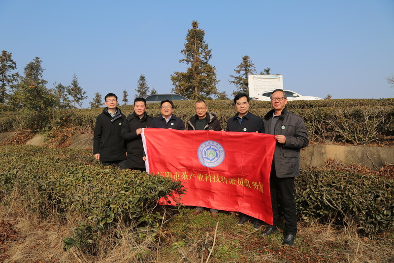 在罗山县潘新镇申林茶叶开发有限公司万亩茶园,服务队成员通过多点取样法对茶树生长状况进行详细调查,然后针对茶园土壤养分供给不足等问题提供了科学的解决方案,即撒施适量的茶叶专用配方肥,确保春茶采摘期土壤肥力持续供应,实现春茶增产增收和品质提升。在公司的标准化、生态化示范茶园建设现场,服务队专家就茶树品种引进、机械化配套设施、茶文旅融合等亟需解决的问题与公司负责人马健进行了交流与沟通。针对公司新开发的砖茶产品存在“发花”密度不高等技术难题,茶学专家王广铭副教授、尹鹏博士等根据自身的专业特长进行了指导,将此产业中出现的难题作为今后科学研究的课题,开展技术攻关。植保专家史洪中和陈利军教授、郭世保博士认真查看了当前茶园生长情况病虫害越冬基数,提出绿色防控技术方案。范宏伟副教授指出当前应该适当对茶树枯枝进行修剪,以增加开采期的发芽密度,同时要加强水肥管理,可撒施专用配方肥以增加开采期的产量和品质。