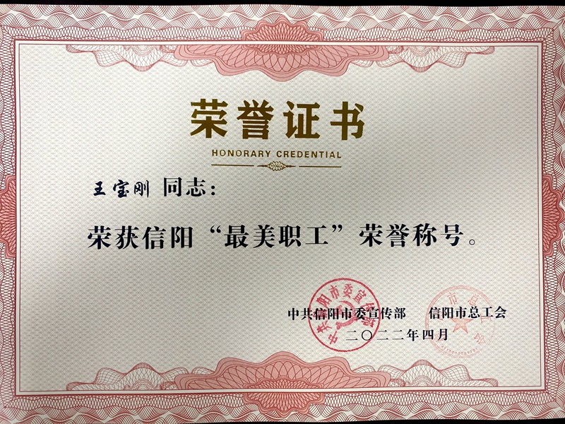 近日,根据《中共信阳市委宣传部、信阳市总工会关于表彰2022年信阳“最美职工”和信阳市职工职业道德建设标兵单位、标兵个人的决定》(信工文〔2022〕21号),beat365在线平台官网工会推荐的王宝刚老师荣获2022年信阳“最美职工”荣誉称号。