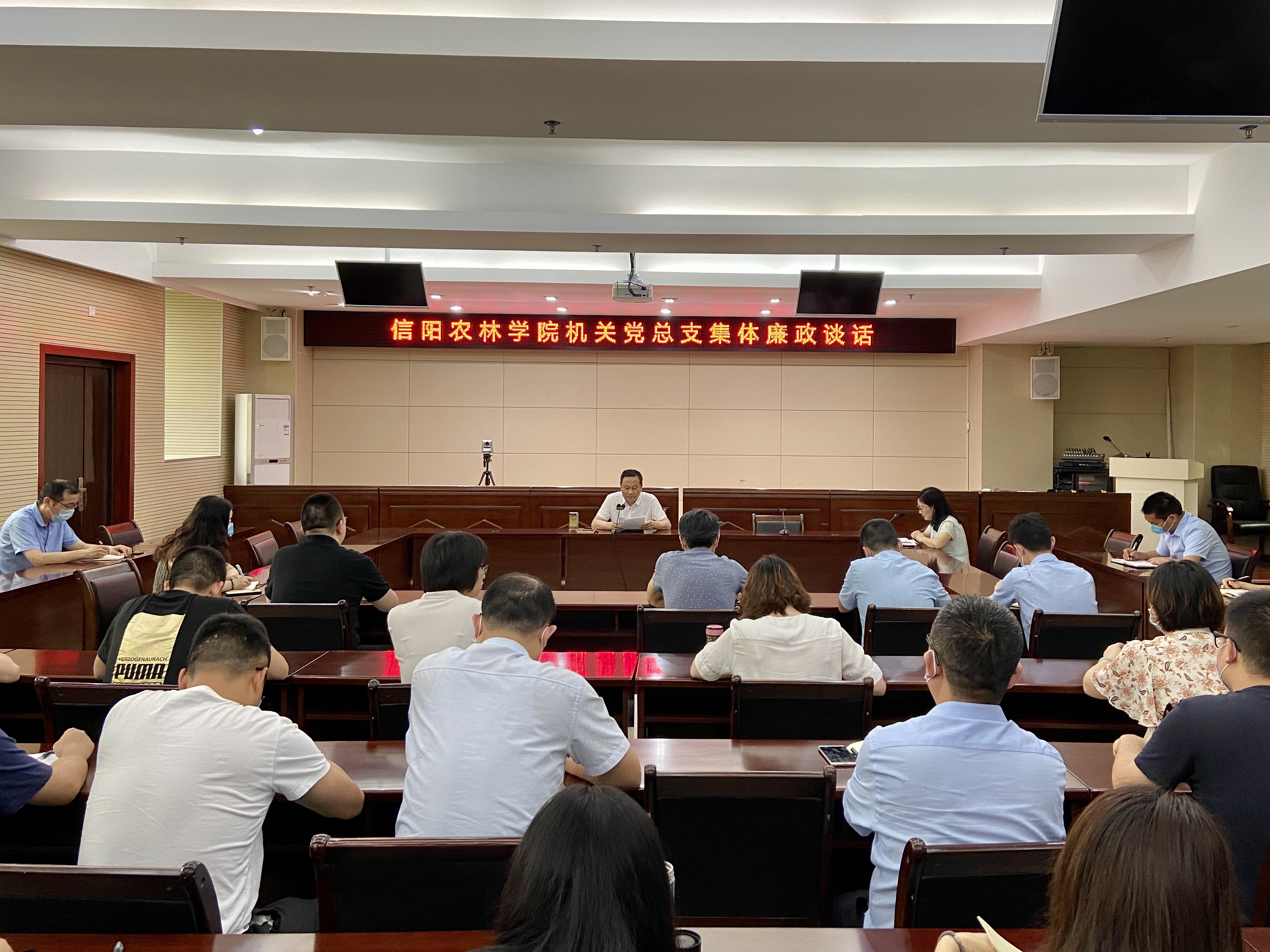 根据校纪委要求,为进一步推进党风廉政建设和干部队伍建设, 6月9日,机关党总支在综合楼一楼召开集体廉政谈话,机关党总支书记宋建军、副书记易雯雯以及新提拔和交流任职科级干部参加了集体廉政谈话。