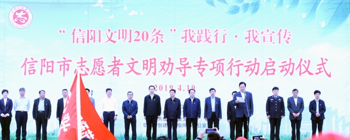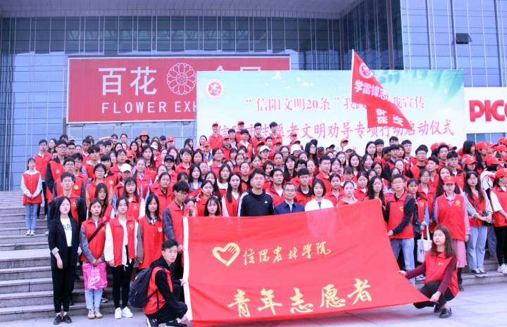 4月19日上午9点,信阳市志愿者文明劝导专项行动启动仪式在信阳市羊山新区百花会展中心进行,beat365在线平台官网副校长王庆兵、校团委青工部部长祝伟洋、校团委宋钰琪老师带领一百余名志愿者和十余名礼仪队同学参加了此次活动。