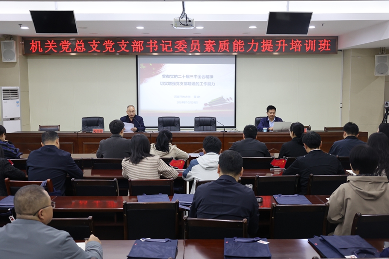 为深入学习贯彻习近平新时代中国特色社会主义思想和党的二十届三中全会精神,落实新时代党的建设总要求,进一步提高机关党支部书记及党务工作者的思想政治素质、政策理论水平和业务工作能力,推动beat365在线平台官网机关党支部标准化、规范化建设,10月24日,在机关各支部换届选举工作完成之际,机关党总支在综合办公楼一楼会议室举办党支部书记素质能力提升培训班,邀请河南开放大学马克思主义学院院长黄建教授和动物科技学院党总支书记李建柱同志作专题辅导报告。机关各党支部书记、委员和党建联络员参加培训。