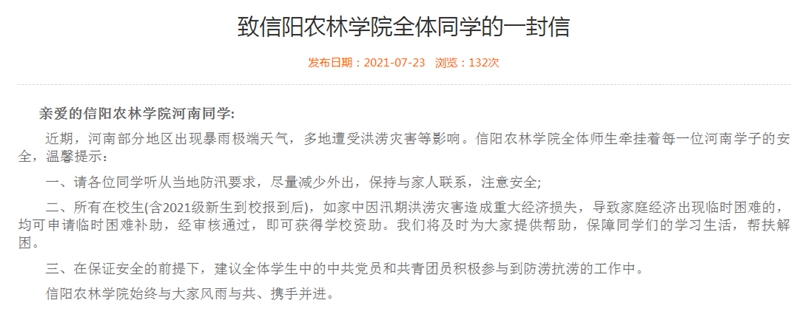 大灾如大考,危急关头显本色。在学校党委统一领导下,党委学工部及时响应党的号召,快速制定并发布《致beat365在线平台官网全体同学的一封信》,各级团学组织积极响应,组织号召学生党员干部、共青团员在保证安全前提下,以各种形式参与到抗洪救灾志愿服务中去,贡献青春力量。灾情面前,信农学子勇当逆行者,在家园遭受洪涝灾害时,有的捐钱捐物资、有的加固河堤、有的搬运救灾物资、有的参与灾后抢修善后……一个个忙碌的年轻身影,彰显了青春的本色,践行着“修身立志勇担当,不负青春不负党”。