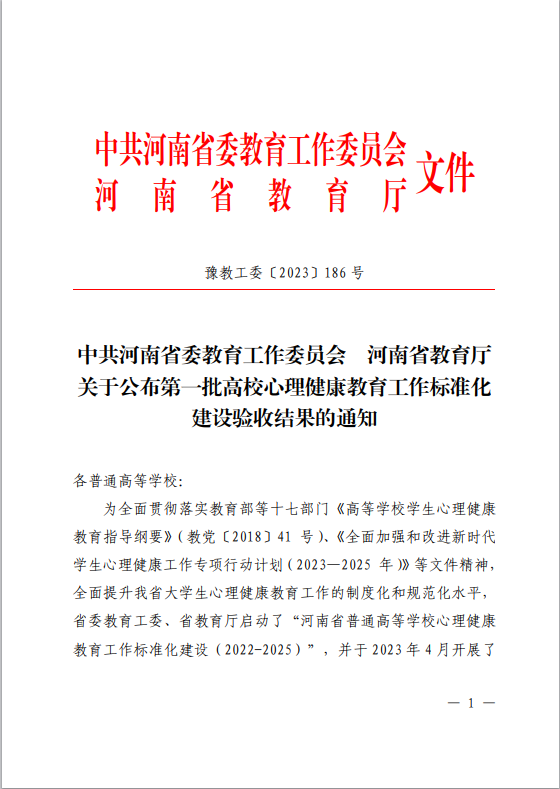 近日,中共河南省委教育工委、河南省教育厅下发了《关于公布第一批高校心理健康教育工作标准化建设验收结果的通知》(豫教工委〔2023〕186 号),beat365在线平台官网顺利通过验收,并获得“河南省高校心理健康教育工作标准化建设特色学校”荣誉称号。