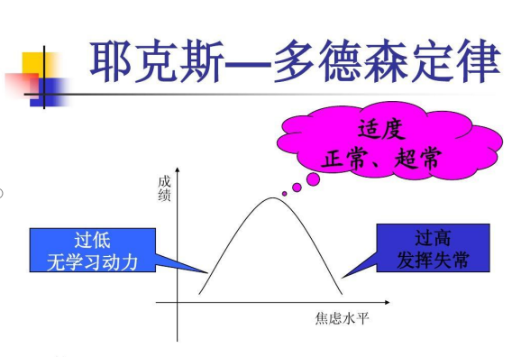 根据耶克斯-多德森定律,焦虑和压力水平过低会让我们动力不足过高会干预记忆和思维活动的顺利进行,降低学习效率,只有当焦虑程度适中时,我们才可以正常甚至超长发挥。