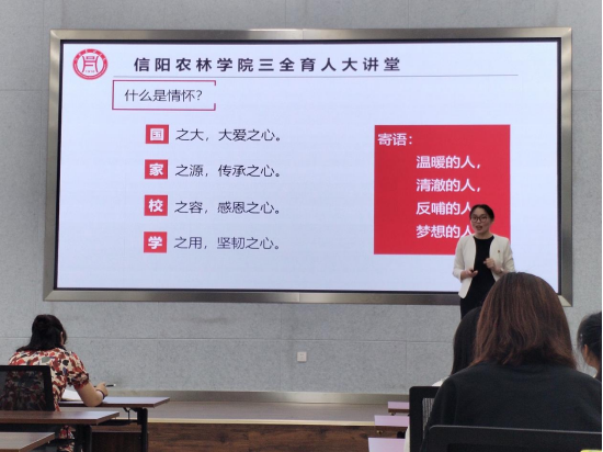 史亚奇以“我心中的诗和远方——做一个有情怀的人”为主题,首先通过一首熟悉的儿歌《让我们荡起双桨》,激发出师生温暖的回忆,给同学们解答选取“做一个有情怀的人”为题的原因。紧接着她从国、家、校、学四个方面来讲解如何去做一个有情怀的人?她通过解析祖国的大好山河,展现“国之大”要有大爱之心;通过电影“我和我的家乡”和她的家风传承,告诉同学们要坚持做守根人,展现“家之源”要有传承之心;通过自己各类教学比赛的阅历和15年见证的校园里的故事,希望我们都能够展现“校之容”要有感恩之心;通过结合自身大学四年德、智、体、美、劳全面发展的校园生活,与同学的同学情和与老师的师生情,勉励同学们要展现“学之用”要有坚韧之心。史亚奇老师幽默轻松的授课方式,深受同学们的喜爱,她灵动的讲解也展现出她深厚的专业知识积累,赢得了阵阵掌声。最后史亚奇老师殷切的寄语同学们做个温暖的人,清澈的人,反哺的人,梦想的人!
