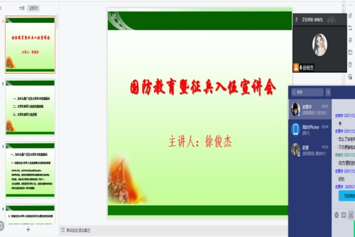 为进一步增强我院大学生的国防观念意识,引导大学生积极参军入伍,12月10日晚上,林学院通过腾讯会议平台开展国防教育暨征兵入伍宣讲会。宣讲会由徐俊杰老师主持,林学院大一全体新生参加。