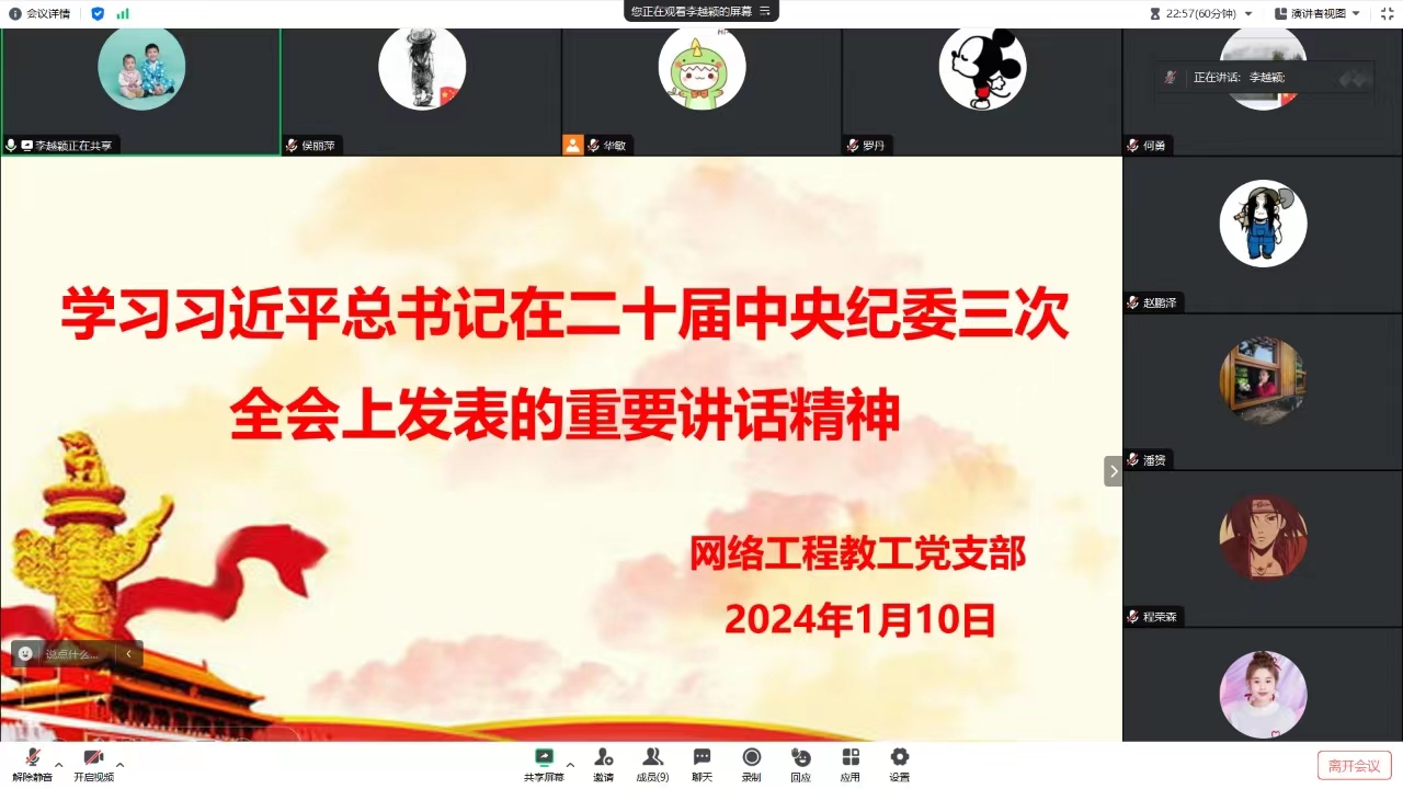 1月10日晚8点,网络工程教工党支部线上开展了集中学习习近平总书记在二十届中央纪委三次全会上的重要讲话精神主题党日活动,会议由支部书记华敏主持,支部全体党员参加。
