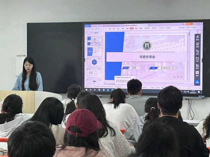 随后,2024届毕业生代表张若冰、杨康、董晨曦、薛佳佳四名同学先后作了实习就业考研经验分享。他们详细地讲述了自己的面试技巧、实习过程中的心得以及备考策略,为即将步入社会的学生们提供了宝贵的参考,也让他们对未来的职业规划有了更加清晰的认识。