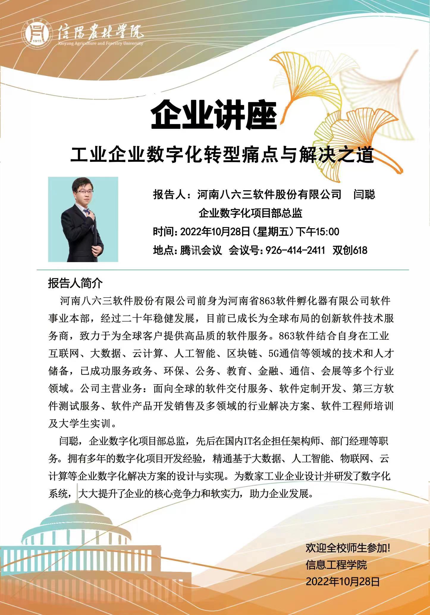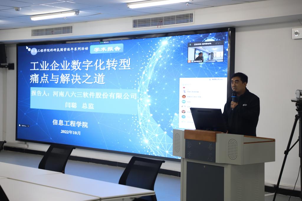 10月28日下午,信息工程学院邀请河南八六三软件股份有限公司企业数字化项目部总监闫聪为学院师生做了题为“工业企业数字化转型痛点与解决之道”的讲座。讲座由信息工程学院副院长潘赟主持,信息工程学院青年教师和数据科学与大数据技术专业学生参加此次讲座。