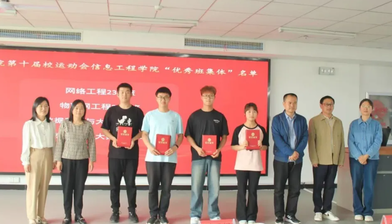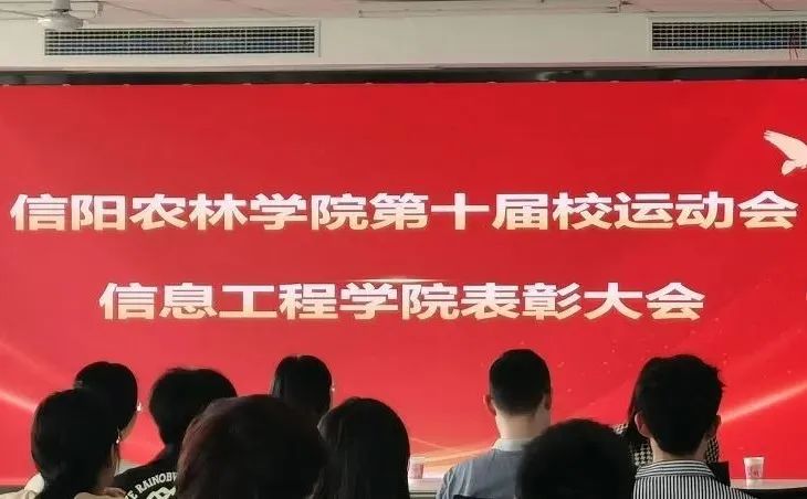 4月25日,信息工程学院第十届校运会表彰大会于双创618举行。院党总支书记栗磊、院长赵喜玲、副院长何勇、院办主任刘丽娟、团总支书记严舒平及多位辅导员老师出席会议。