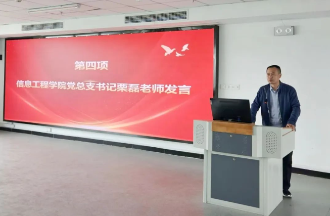 大会第四项,由信息工程学院党总支书记栗磊对大会进行总结,栗磊书记用先辈们的事迹来鼓励我们,要如激流一般勇往直前,不畏艰难,不惧挑战。他的讲话字里行间充满力量,激励大家奋勇向前。