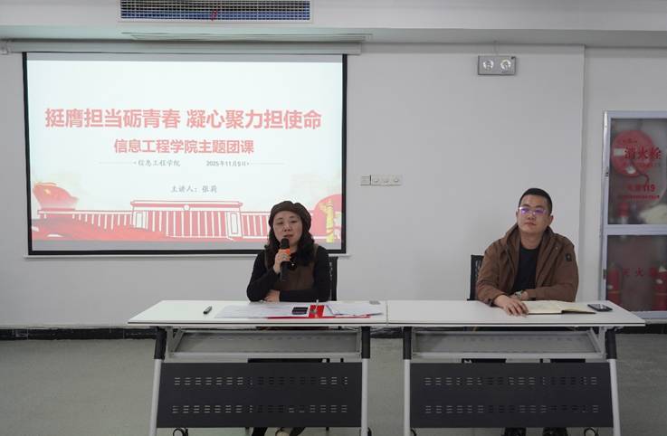信息工程学院团委书记张莉老师于11月5日以“挺膺担当砺青春,凝心聚力担使命”为切入点,为各团支部代表讲授关于学习党的二十届四中全会精神的团课。结合“像新中国发展那样规划个人成长”的青年成长理念,鼓励同学们将个人理想融入集体目标:既有“坚定做自己”的信念,也有“聚气聚神、协同奋进”的担当。