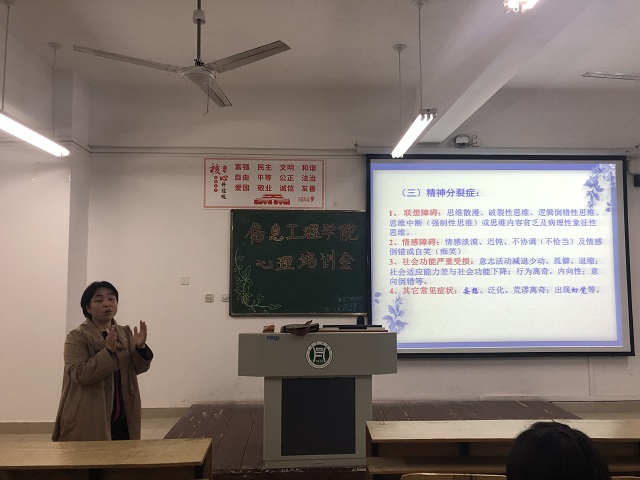 为进一步促进学院心理工作的开展,加深同学们对心理健康知识的了解,2019年11月12日晚7点,信息工程学院于二教307开展了心理工作专题培训会。本次培训会由校心理健康教育与咨询中心尚会静老师主讲,院心理专员许华瑾老师、院心理部全体成员、19级各班心理委员及寝室长参与培训。